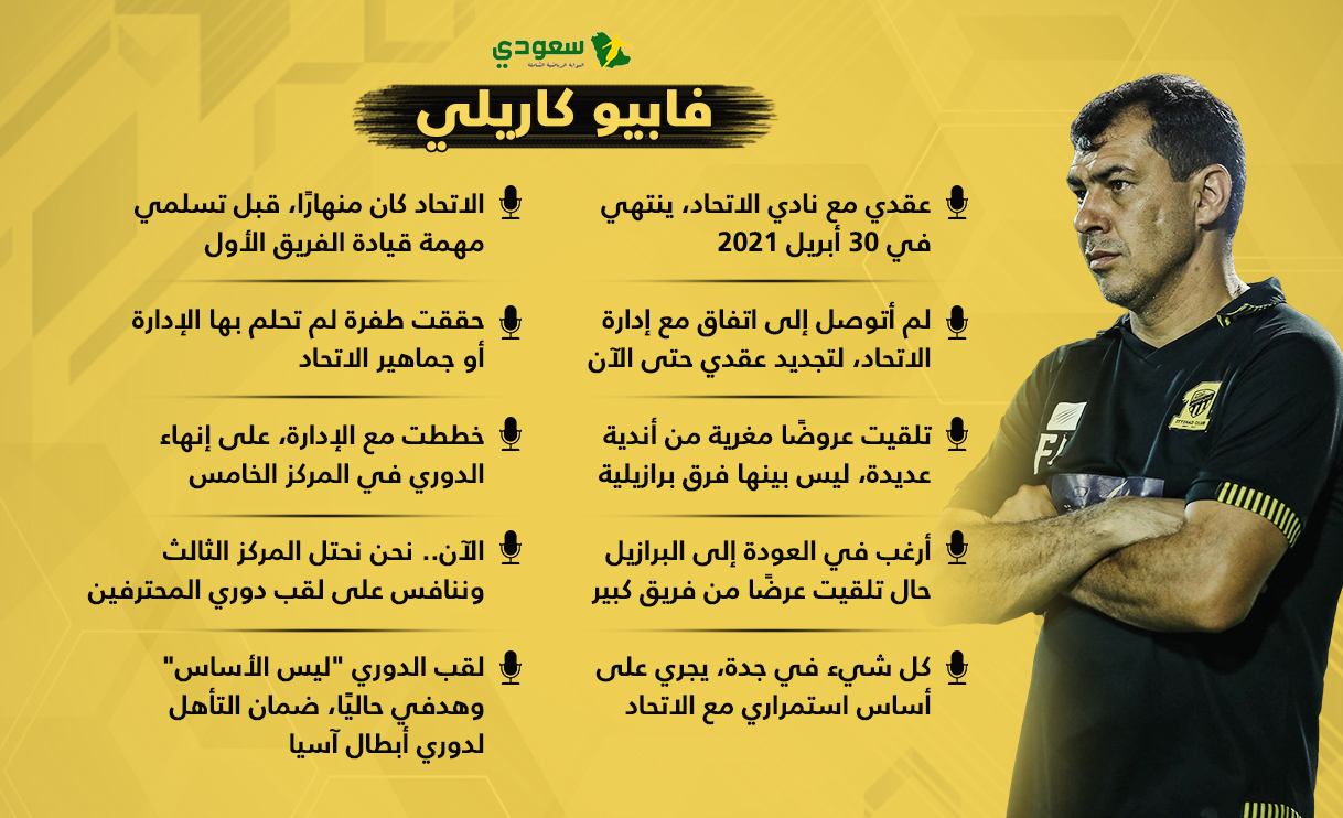 Jun 22, 2021 · كشفت تقارير، اليوم (الثلاثاء) عن حسم المدير الفني لنادي الاتحاد، المدرب البرازيلي فابيو كاريلي موقف لاعبي الفريق المعارين منذ الموسم الماضي.